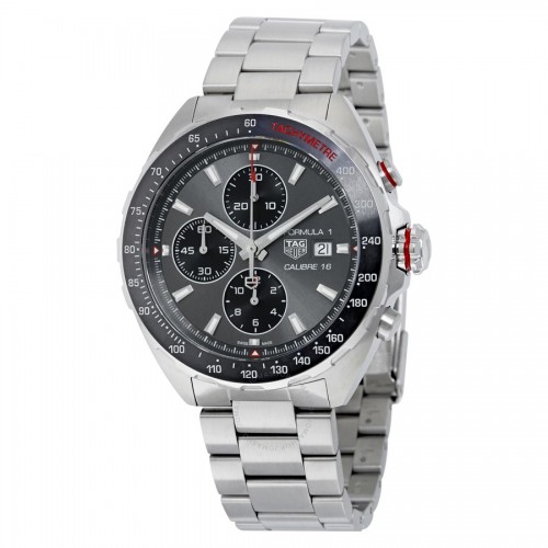 Stainless steel case with a stainless steel bracelet. Fixed stainless steel bezel with a grey top ring showing tachmeter markings. Grey dial with luminous silver-tone hands and index hour markers. Minute markers around the outer rim. Dial Type: Analog. Luminescent hands and markers. Date display at the 3 o'clock position. Chronograph three sub-dials displaying: 60 second, 30 minute and 1/10th of a second. Automatic movement with a 42-hpour power reserve. Scratch resistant sapphire crystal. Screw down crown. Solid case back. Case size: 44 mm. Case thickness: 15 mm. Round case shape. Band width: 21 mm. Fold over clasp.Functions: chronograph, tachymeter, date, hour, minute, second. Luxury watch style