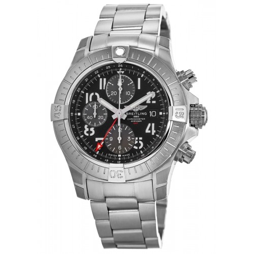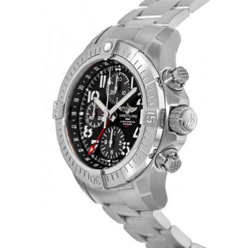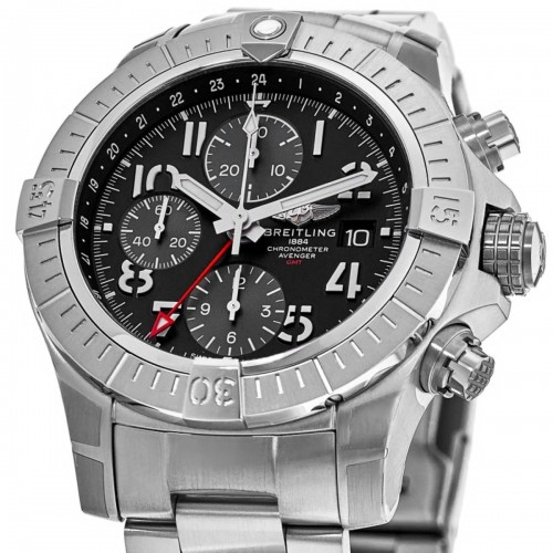 Breitling Avenger Chronograph GMT 45 Black Dial Steel Men‘s Watch Model A24315101B1A1. Stainless Steel case with Stainless Steel watch band. Unidirectional Ratcheted Rotating Bezel bezel. Dial description: Luminescent Hands and Number Hour Markers With 3 Sub-Dials and the Date Displayed at 3 o‘clock on a Black dial. Self-Winding Mechanical, 2nd Timezone (24 hr) movement. Calendar: Date at 3 o‘clock. Chronograph sub-dials display: 1/10th of a Second, 30 Minute, 12 hours (GMT). Powered by Breitling Caliber 24 engine with 42 hours power reserve. Watch functions: Date, 24 Hour, Power Reserve, Hour, Minute, Second, Chronograph, GMT. Screw-Locked, Two Gaskets crown. Scratch Resistant Sapphire crystal. Round case shape. Case size: 45mm. Case thickness: 16.4mm. 300 Meters - 990 Feet water resistant. 2 year .