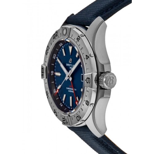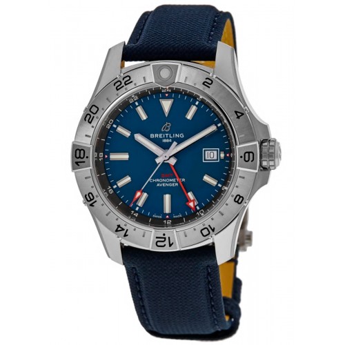 Breitling Avenger Automatic GMT 44 Blue Dial Leather Strap Men‘s Sports Watch Model A32320101C1X1. Brushed and Polished Stainless Steel. case with Blue Calfskin Leather Strap. strap. Brushed and Polished Stainless Steel Folding clasp. Rotating Pinion Bezel with 24 Hour Time Zone Indication. bezel. Dial description: Luminous Silver Hands and Stick Hour Markers with a Central Red GMT Hand and Markers Around the Outer Rim and the Date at 3 o‘clock on a Blue Dial. dial. Automatic - Chronometer, 2nd & 3rd Time Zones movement. Calendar: Date at 3 o‘clock. Chronograph sub-dials display: 24 Hour, Date. Powered by Breitling Caliber 32 engine with 42 hours power reserve. Watch functions: Date, 24 Hour, Power Reserve, Hour, Minute, Second, GMT. Screw In crown. Scratch Resistant Sapphire crystal. Round case shape. Case size: 44mm. Solid case back. .