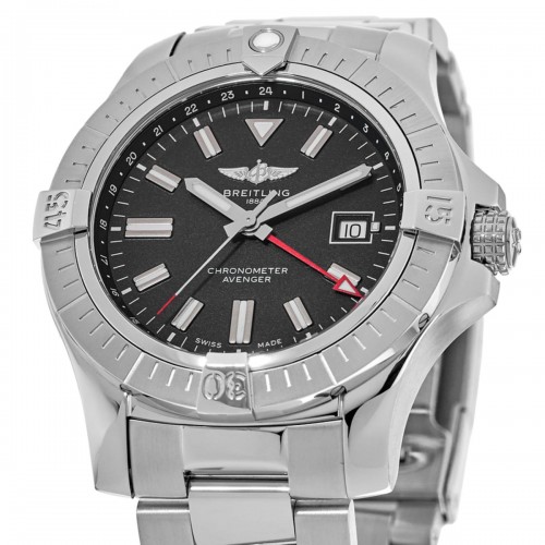 Breitling Avenger Automatic GMT 43 Black Dial Steel Men‘s Watch Model A32397101B1A1. Stainless Steel case with Stainless Steel watch band. Folding clasp. Uni-Directional Rotating bezel. Dial description: Silver tone hands and Index hour markers with minute markers around the outer rim on a Black dial. Automatic Chronometer movement. Powered by Breitling Calibre 32 engine with 42 hours power reserve. Watch functions: Date, Power Reserve, Hour, Minute, Second, GMT. Screw In crown. Scratch Resistant Sapphire crystal. Round case shape. Case size: 43mm. Solid case back. .