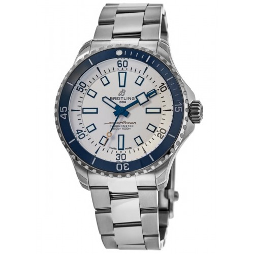 Breitling Superocean Automatic 42 Silver Dial Steel Men‘s Watch Model A17375E71G1A1. Stainless Steel case with Stainless Steel watch band. Uni-Directional Rotating bezel. Dial description: Blue Luminous hands with Index hour markers and minute markers around the outer rim on a Silver dial. Automatic - Chronometer movement. Powered by Breitling Calibre 17 engine with 38 hours power reserve. Watch functions: Power Reserve, Hour, Minute, Second. Screw Down crown. Scratch Resistant Sapphire crystal. Round case shape. Case size: 42mm. Case thickness: 12.5mm. Solid case back. .