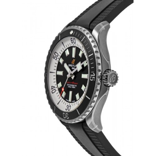 Breitling Superocean Automatic 44 Black Dial Rubber Strap Men‘s Watch Model A17376211B1S1. Stainless Steel case with Black Rubber strap. Folding clasp. Uni-Directional Rotating bezel. Dial description: Silver tone Luminous hands with Index hour markers and minute markers around the outer rim on a Black dial. Automatic - Chronometer movement. Powered by Breitling Calibre 17 engine with 38 hours power reserve. Watch functions: Power Reserve, Hour, Minute, Second. Screw Down crown. Scratch Resistant Sapphire crystal. Round case shape. Case size: 44mm. Case thickness: 12.6mm. Solid case back. .