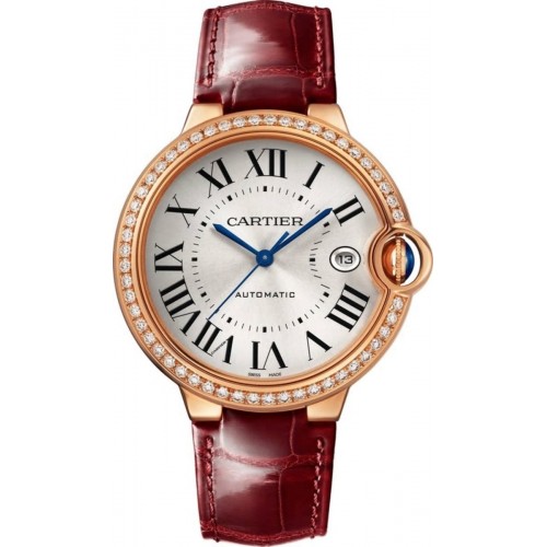 Cartier Ballon Bleu de Cartier Silver Dial 18kt Rose Gold Diamond Leather Strap Women‘s Watch Model WJBB0056. 18K Rose Gold case with Burgundy Alligator Leather strap. 18K Rose Gold Tang clasp. Fixed- Diamond Set bezel. Dial description: Blue Steeled Hands and Black Roman Numeral Hour Markers with minute markers around the inner rim on a Silver dial. Automatic movement. Watch functions: Date, Hour, Minute, Second. Fluted, Set with a Sapphire Cabochon crown. Scratch Resistant Sapphire crystal. Round case shape. Case size: 40mm. Case thickness: 12.4mm. Solid case back. .