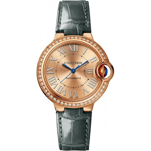 Cartier Ballon Bleu de Cartier Rose Gold Diamond Leather Strap Women‘s Watch Model WJBB0076. 18kt Rose Gold case with Grey Alligator Leather strap. 18K Rose Gold Tang clasp. Fixed 47 Brilliant-Cut Diamonds Totaling 0.68 Carats bezel. Dial description: Blue Hands and Roman Numeral hour markers with minute markers around the inner rim on a Rose Gold dial. Automatic movement. Watch functions: Hour, Minute, Second. Fluted, Set with a Sapphire Cabochon crown. Scratch Resistant Sapphire crystal. Round case shape. Case size: 33mm. Case thickness: 9.96mm. 30 Meters - 100 Feet water resistant. 2 year .