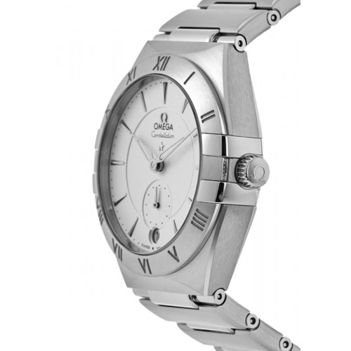 Omega Constellation Small Seconds Silver Dial Stainless Steel Women‘s Watch Model 131.10.34.20.02.001. Stainless Steel case with Silver Stainless Steel Brushed and Polished watch band. Deployment with Push Button and Foldover clasp. Fixed bezel. Dial description: Silver tone hands and Index hour markers with minute markers around the outer rim and a small seconds sub-dial on a Silver dial. Automatic Chronometer movement. Chronograph sub-dials display: 60 Second. Powered by Omega Calibre 8802 engine with 55 hours power reserve. Watch functions: Hour, Minute, Second, Power Reserve, Date. Scratch Resistant Sapphire crystal. Round case shape. Case size: 34mm. Transparent case back. . Also known as model: 13110342002001.