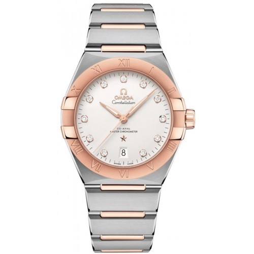 Omega Constellation Co-Axial Master Chronometer Silver Diamond Dial Rose Gold and Stainless Steel Men‘s Watch Model 131.20.39.20.52.001. Sedna鈩?Gold and Stainless Steel case with Brushed and Polished Sedna鈩?Gold and Stainless Steel watch band. Deployment with Push Button and Foldover clasp. Fixed bezel. Dial description: Rose Gold tone hands and Diamond hour markers with minute markers around the outer rim on a Silver dial. Automatic movement. Powered by Omega Calibre 8800 engine with 55 hours power reserve. Watch functions: Date, Power Reserve, Hour, Minute, Second. Scratch Resistant Sapphire crystal. Round case shape. Case size: 39mm. Transparent case back. . Also known as model: 13120392052001.