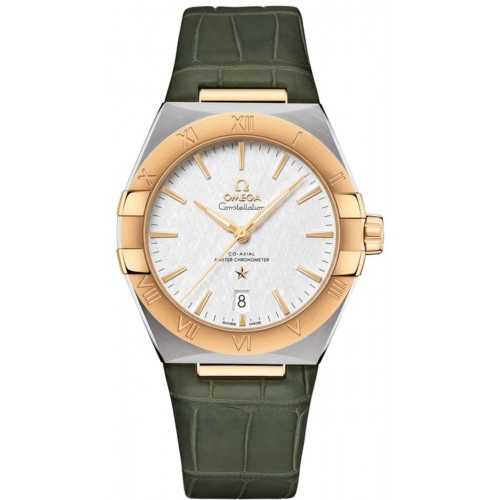 Omega Constellation Co-Axial Master Chronometer Silver Dial 18K Yellow Gold Green Leather Strap Men‘s Watch Model 131.23.39.20.02.002. Stainless Steel and 18K Yellow Gold case with Green Leather with Rubber Lining strap. Tang clasp. Fixed, 18K Yellow Gold with Roman Numerals bezel. Dial description: Gold tone hands and Index hour markers with minute markers around the outer rim on a Silver dial. Automatic Chronometer movement. Powered by Omega Calibre 8800 engine with 55 hours power reserve. Watch functions: Date, Power Reserve, Hour, Minute, Second. Scratch Resistant Sapphire crystal. Round case shape. Case size: 39mm. Transparent case back. . Also known as model: 13123392002002.