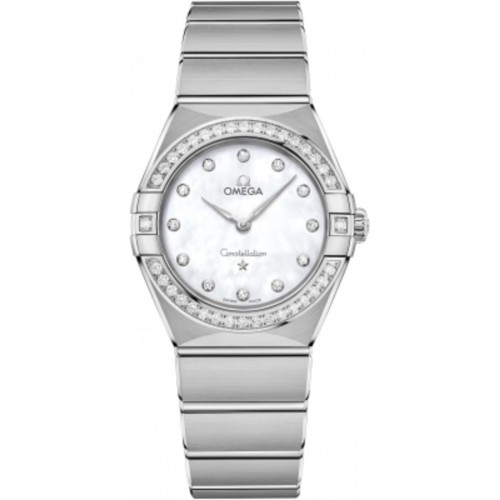 Omega Constellation Manhattan Quartz 28mm Mother of Pearl Dial Diamond Stainless Steel Women‘s Watch Model 131.15.28.60.55.001. Stainless Steel case with Silver Stainless Steel Brushed and Polished watch band. Deployment with Push Button and Foldover clasp. Fixed bezel. Dial description: Silver tone hands with Diamond hour markers on a Mother of Pearl dial. Quartz movement. Powered by Omega Caliber 4061 engine. Watch functions: Hour, Minute. Scratch Resistant Sapphire crystal. Round case shape. Case size: 28mm. Solid case back. . Also known as model: 13115286055001.