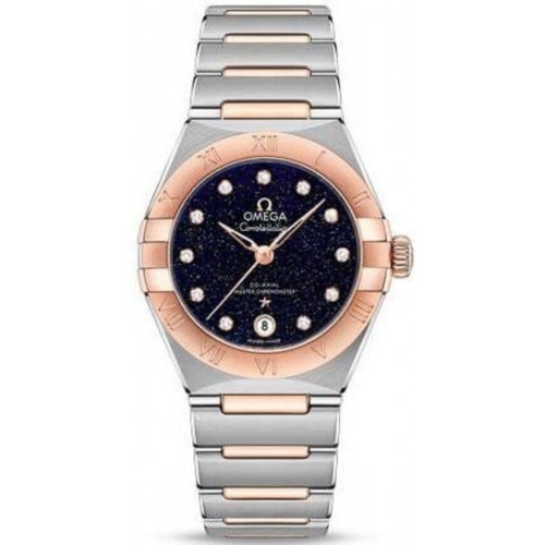 Omega Constellation Manhattan Chronometer 29mm Blue Dial Diamond Rose Gold and Stainless Steel Women‘s Watch Model 131.20.29.20.53.002. Sedna鈩?Gold and Stainless Steel case with Brushed and Polished Sedna鈩?Gold and Stainless Steel watch band. Deployment with Push Button and Foldover clasp. Fixed bezel. Dial description: Rose Gold hands with Diamond hour markers on a Blue dial. Automatic Chronometer movement. Powered by Omega Calibre 8700 engine with 50 hours power reserve. Watch functions: Date, Power Reserve, Hour, Minute, Second. Scratch Resistant Sapphire crystal. Round case shape. Case size: 29mm. Transparent case back. . Also known as model: 13120292053002.
