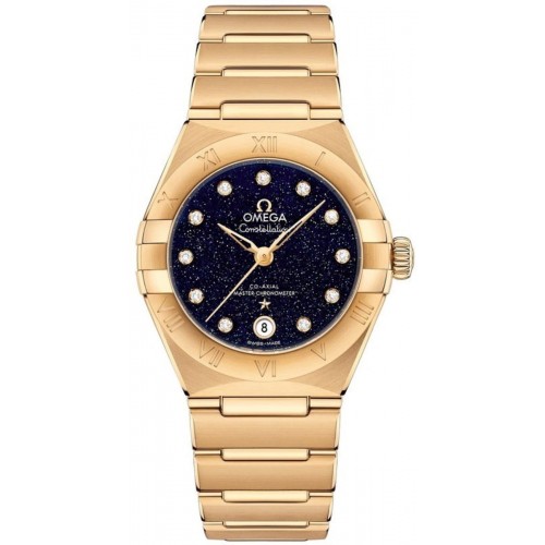 Omega Constellation Manhattan Chronometer 29mm Blue Dial Diamond Yellow Gold Women‘s Watch Model 131.50.29.20.53.002. Yellow Gold case with Brushed and Polished Yellow Gold watch band. Deployment with Push Button and Foldover clasp. Fixed bezel. Dial description: Yellow Gold hands and Diamond hour markers on a Blue dial. Automatic Chronometer movement. Powered by Omega Calibre 8701 engine with 50 hours power reserve. Watch functions: Date, Power Reserve, Hour, Minute, Second. Scratch Resistant Sapphire crystal. Round case shape. Case size: 29mm. Transparent case back. . Also known as model: 13150292053002.