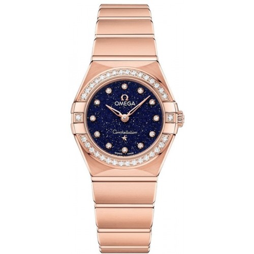 Omega Constellation Manhattan Quartz 25mm Blue Dial Diamond Rose Gold Women‘s Watch Model 131.55.25.60.53.002. Sedna鈩?Gold case with Brushed and Polished Sedna鈩?Gold watch band. Deployment with Push Button and Foldover clasp. Fixed, Diamond-paved bezel. Dial description: Rose Gold hands with Diamond hour markers on a Blue dial. Quartz movement. Watch functions: Hour, Minute. Scratch Resistant Sapphire crystal. Round case shape. Case size: 25mm. Solid case back. . Also known as model: 13155256053002.