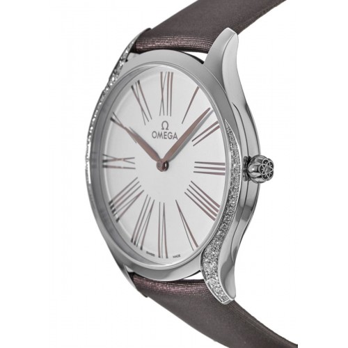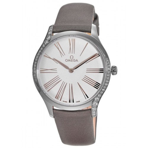 Omega De Ville Tresor Diamond Bezel Fabric Strap Women‘s Watch Model 428.17.39.60.02.001. Stainless Steel Set With 2 Curving Rows of Diamonds case with Grey Satin Fabric strap. Tang clasp. Fixed bezel. Dial description: 18K Rose Gold hands and Roman Numeral hour markers on a Silver dial. Quartz movement. Powered by Omega Calibre 4061 engine. Watch functions: Hour, Minute. The crown is polished with red HyCeram and set with a single diamond. crown. Scratch Resistant Sapphire crystal. Round case shape. Case size: 39mm. Solid case back. . Also known as model: 42817396002001.