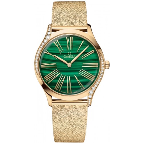 Omega De Ville Tresor Green Dial Diamond Yellow Gold Women‘s Luxury Watch Model 428.55.36.60.99.003. 18K Yellow Gold With 2 Curving Rows Of Diamonds case with Yellow Gold watch band. Deployment with Foldover clasp. Fixed Diamond Set bezel. Dial description: Gold tone hands and Roman Numeral hour markers on a Green dial. Quartz movement. Powered by Omega Calibre 4061 engine. Watch functions: Hour, Minute. set with a single diamond surrounded by a red ceramic flower made from five OMEGA logos crown. Scratch Resistant Sapphire crystal. Round case shape. Case size: 36mm. special mirrored case back with a "Her Time" pattern. 30 Meters - 100 Feet water resistant. 5 year . Also known as model: 42855366099003.