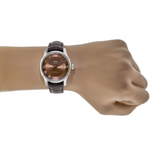 Omega De Ville Hour Vision Automatic Brown Dial Leather Strap Men‘s Watch Model 433.13.41.21.10.001. Stainless Steel case with Brown Alligator Leather strap. Deployment clasp. Fixed bezel. Brown dial. Automatic Self Winding movement. Case size: 41mm. Solid case back. . Also known as model: 43313412110001, 433-13-41-21-10-001, O43313412110001.