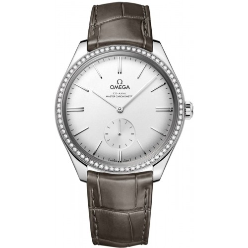 Omega De Ville Tresor Silver Dial Diamond Leather Strap Women‘s Watch Model 435.18.40.21.02.002. Stainless Steel case with Grey Leather strap. Tang clasp. Diamond-Paved bezel. Dial description: 18K White Gold hands and Index hour markers with minute markers around the outer rim and a small seconds sub-dial on a Silver dial. Manual Winding Chronometer movement. Powered by Omega Calibre 8926 engine with 72 hours power reserve. Watch functions: Power Reserve, Hour, Minute, Second. Scratch Resistant Sapphire crystal. Round case shape. Case size: 40mm. Transparent case back. . Also known as model: 43518402102002.