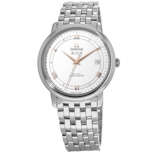 Omega De Ville Prestige Co-Axial 36.8mm Silver Dial Men‘s Luxury Watch Model 424.10.37.20.02.002. Stainless Steel case with Stainless Steel watch band. Deployment clasp. Fixed bezel. Dial description: Rose Gold Tone Hands and Roman Numeral Hour Markers With Minute Markers Around The Outer Rim On a Silver dial. Automatic- Chronometer movement. Powered by Omega Calibre 2500 engine with 48 hours power reserve. Watch functions: Date, Hour, Minute, Second. Scratch Resistant Sapphire crystal. Round case shape. Case size: 36.8mm. Solid case back. . Also known as model: 42410372002002, O42410372002002.