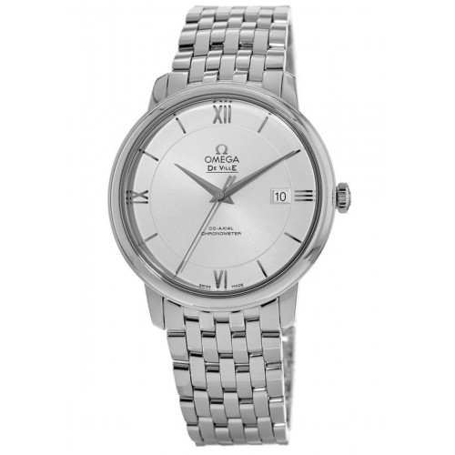 Omega De Ville Prestige Co-Axial 39.5mm Opaline-Silvery Dial Men‘s Watch Model 424.10.40.20.02.003. Stainless Steel Polished case with Silver Stainless Steel Polished watch band. Folding clasp. Fixed-Domed bezel. Dial description: Silver toned hands and alternating Roman Numerals/Index hour markers on a Sun-brushed Silver dial. Automatic - Chronometer movement. Powered by Omega Calibre 2500 engine with 48 hours power reserve. Watch functions: Date, Power Reserve, Hour, Minute, Second. Pull/Push crown. Scratch Resistant Sapphire crystal. Round case shape. Case size: 39.5mm. Case thickness: 10mm. Solid case back. . Also known as model: 42410402002003.
