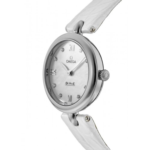 Omega De Ville Prestige Quartz 27.4mm Dewdrop Mother of Pearl Diamond Dial Women‘s Watch Model 424.13.27.60.55.001. Stainless Steel case with White Leather Alligator strap. Tang clasp. Fixed bezel. Dial description: Polished steel hands With Diamond and Roman Numeral hour markers on a white Mother of Pearl dial. Quartz movement. Powered by Omega Calibre 4061 engine. Watch functions: Hour, Minute. Pull/Push crown. Scratch Resistant Sapphire crystal. Round case shape. Case size: 27mm. Solid case back. .