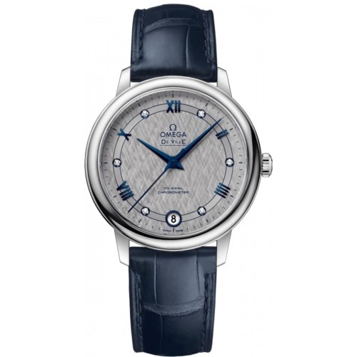 Omega De Ville Prestige Co-Axial 32.7mm Grey Diamond Dial Leather Strap Women‘s Watch Model 424.13.33.20.56.002. Stainless Steel case with Blue Leather Alligator strap. Tang clasp. Fixed bezel. Dial description: Blue hands and Diamond/Roman Numeral hour markers with minute markers around the outer rim on a Grey dial. Automatic movement. Powered by Omega Caliber 2500 engine with 48 hours power reserve. Watch functions: Date, Power Reserve, Hour, Minute, Second. Scratch Resistant Sapphire crystal. Round case shape. Case size: 32.7mm. Solid case back. . Also known as model: 42413332056002.