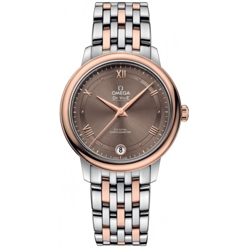 Omega De Ville Prestige Co-Axial 32.7mm Brown Dial Rose Gold and Steel Women‘s Watch Model 424.20.33.20.13.001. Stainless Steel & Rose Gold case with Polished Stainless Steel & Rose Gold watch band. Push Button Foldover Clasp clasp. Dial description: Rose Gold hands and alternating Roman Numeral/Cabochon hour markers with minute markers around the outer rim on a Brown dial. Automatic Self Winding - Chronometer movement. Powered by Omega Calibre 2500 engine with 48 hours power reserve. Watch functions: Hour, Minute, Second, Power Reserve, Date. Scratch Resistant Sapphire crystal. Round case shape. Case size: 32.7mm. Solid case back. . Also known as model: 42420332013001.