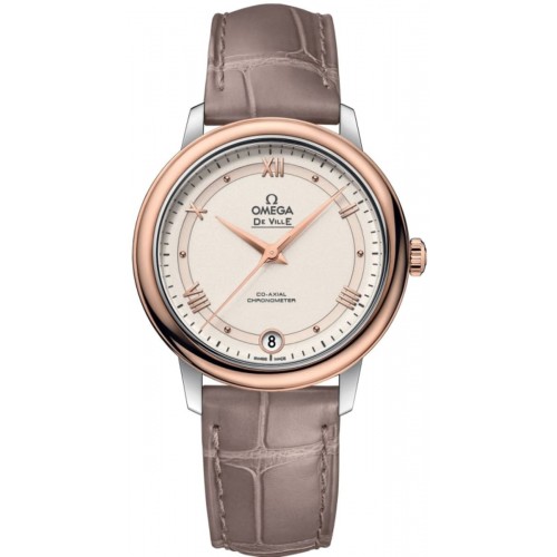 Omega De Ville Prestige Co-Axial 32.7mm Ivory Dial Steel and Rose Gold Leather Strap Women‘s Watch Model 424.23.33.20.09.001. Rose Gold & Stainless Steel case with Brown Leather Alligator strap. Tang clasp. Fixed bezel. Dial description: Rose Gold hands and Alternating Roman Numeral/Cabochon hour markers with minute markers around the outer rim on an Ivory dial. Automatic - Chronometer movement. Powered by Omega Calibre 2500 engine with 48 hours power reserve. Watch functions: Date, Power Reserve, Hour, Minute, Second. Scratch Resistant Sapphire crystal. Round case shape. Case size: 32.7mm. Solid case back. . Also known as model: 42423332009001.