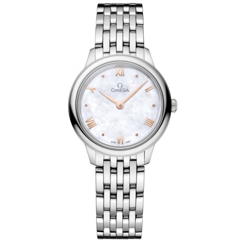 Omega De Ville Prestige Quartz 27.5mm Mother of Pearl Dial Steel Women‘s Watch Model 434.10.28.60.05.001. Stainless Steel case with Stainless Steel watch band. Deployment clasp. Dial description: Rose Gold tone hands and Roman Numeral/Index hour markers on a Mother of Pearl dial. Quartz movement. Powered by Omega Caliber 4061 engine. Watch functions: Hour, Minute. Scratch Resistant Sapphire crystal. Round case shape. Case size: 27.5mm. Case thickness: 6.3mm. Solid case back. . Also known as model: 43410286005001.