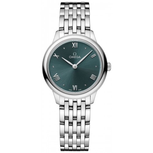 Omega De Ville Prestige Quartz 27.5mm Green Dial Steel Women‘s Watch Model 434.10.28.60.10.001. Stainless Steel case with Stainless Steel watch band. Deployment clasp. Dial description: Silver tone hands and Roman Numeral/Index hour markers on a Green dial. Quartz movement. Powered by Omega Caliber 4061 engine. Watch functions: Hour, Minute. Scratch Resistant Sapphire crystal. Round case shape. Case size: 27.5mm. Case thickness: 6.3mm. Solid case back. . Also known as model: 43410286010001.