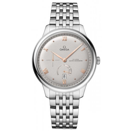 Omega De Ville Prestige Grey Dial Steel Men‘s Watch Model 434.10.41.21.06.001. Stainless Steel case with Stainless Steel watch band. Deployment clasp. Dial description: Rose Gold tone hands and Roman Numeral/Index hour markers with minute markers around the outer rim and 2 sub-dials on a Silver dial. Automatic movement. Calendar: Date at 6 o‘clock. Chronograph sub-dials display: Small Seconds, Power Reserve. Powered by Omega Calibre 8810 engine with 55 hours power reserve. Watch functions: Hour, Minute, Second, Date, Power Reserve. Scratch Resistant Sapphire crystal. Round case shape. Case size: 41mm. Case thickness: 10.8mm. Transparent case back. . Also known as model: 43410412106001.