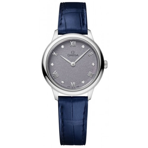 Omega De Ville Prestige Quartz 27.5mm Lavender Diamond Dial Leather Strap Women‘s Watch Model 434.13.28.60.53.001. Stainless Steel case with Blue Alligator Leather strap. Tang clasp. Dial description: Silver tone hands and Roman Numeral/Diamond hour markers on a Lavender dial. Quartz movement. Powered by Omega Caliber 4061 engine. Watch functions: Hour, Minute. Scratch Resistant Sapphire crystal. Round case shape. Case size: 27.5mm. Case thickness: 6.3mm. Solid case back. . Also known as model: 43413286053001.
