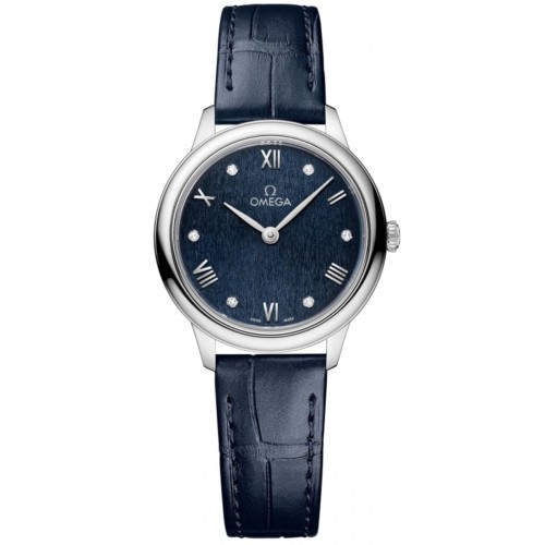 Omega De Ville Prestige Quartz 27.5mm Blue Diamond Dial Leather Strap Women‘s Watch Model 434.13.28.60.53.002. Stainless Steel case with Blue Alligator Leather strap. Tang clasp. Dial description: Silver tone hands and Roman Numeral/Diamond hour markers on a Blue dial. Quartz movement. Powered by Omega Caliber 4061 engine. Watch functions: Hour, Minute. Scratch Resistant Sapphire crystal. Round case shape. Case size: 27.5mm. Case thickness: 6.3mm. Solid case back. . Also known as model: 43413286053002.