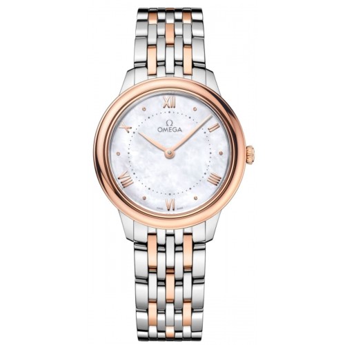 Omega De Ville Prestige Quartz 30mm Mother of Pearl Dial 18k Rose Gold and Steel Women‘s Watch Model 434.20.30.60.05.001. Rose Gold and Stainless Steel case with Rose Gold and Stainless Steel watch band. Deployment clasp. Dial description: Rose Gold tone hands and Roman Numeral/Index hour markers with minute markers around the inner rim on a Mother of Pearl dial. Battery Operated Quartz movement. Powered by Omega Caliber 4061 engine. Watch functions: Hour, Minute. Scratch Resistant Sapphire crystal. Round case shape. Case size: 30mm. Case thickness: 7.3mm. Solid case back. . Also known as model: 43420306005001.