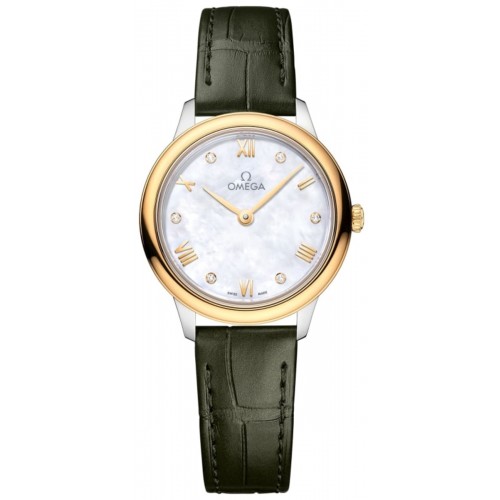 Omega De Ville Prestige Quartz 27.5mm Mother of Pearl Diamond Dial Leather Strap Women‘s Watch Model 434.23.28.60.55.001. Yellow Gold and Stainless Steel case with Green Alligator Leather strap. Tang clasp. Dial description: Yellow Gold tone hands and Roman Numeral/Diamond hour markers on a Mother of Pearl dial. Quartz movement. Powered by Omega Caliber 4061 engine. Watch functions: Hour, Minute. Scratch Resistant Sapphire crystal. Round case shape. Case size: 27.5mm. Case thickness: 7.2mm. Solid case back. . Also known as model: 43423286055001.