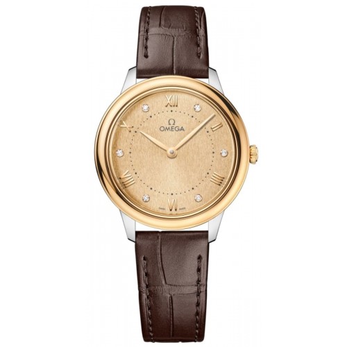 Omega De Ville Prestige Quartz 30mm Gold Diamond Dial Leather Strap Women‘s Watch Model 434.23.30.60.58.001. Yellow Gold and Stainless Steel case with Brown Alligator Leather strap. Tang clasp. Dial description: Gold tone hands and Roman Numeral/Diamond hour markers with minute markers around the inner rim on a Gold dial. Quartz movement. Powered by Omega Caliber 4061 engine. Watch functions: Hour, Minute. Scratch Resistant Sapphire crystal. Round case shape. Case size: 30mm. Case thickness: 7.3mm. Solid case back. . Also known as model: 43423306058001.