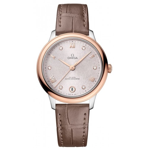 Omega De Ville Prestige Co-Axial Master Chronometer 34mm Silver Diamond Dial Leather Strap Women‘s Watch Model 434.23.34.20.52.003. 18k Rose Gold and Stainless Steel case with Taupe Alligator Leather strap. Tang clasp. Dial description: Rose Gold tone hands and Roman Numeral/Diamond hour markers with minute markers around the outer rim on a Silver dial. Automatic movement. Powered by Omega Calibre 8800 engine with 55 hours power reserve. Watch functions: Date, Power Reserve, Hour, Minute, Second. Scratch Resistant Sapphire crystal. Round case shape. Case size: 34mm. Case thickness: 10.1mm. Transparent case back. . Also known as model: 43423342052003.