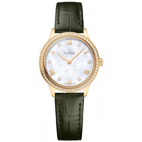 Omega De Ville Prestige Quartz 27.5mm Mother of Pearl Dial Diamond 18k Yellow Gold Leather Strap Women‘s Watch Model 434.58.28.60.55.002. 18K Yellow Gold case with Green Alligator Leather strap. Tang clasp. Diamond Set bezel. Dial description: Gold tone hands and Roman Numeral/Diamond hour markers on a Mother of Pearl dial. Battery Operated Quartz movement. Powered by Omega Caliber 4061 engine. Watch functions: Hour, Minute. Scratch Resistant Sapphire crystal. Round case shape. Case size: 27.5mm. Case thickness: 7.2mm. Solid case back. . Also known as model: 43458286055002.