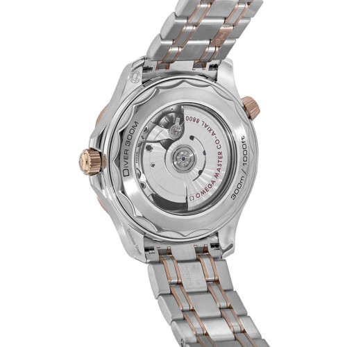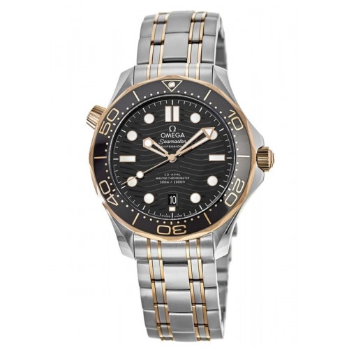 Omega Seamaster Diver 300m Co-Axial Master Chronometer 42mm Sedna Gold & Steel Men‘s Watch Model 210.20.42.20.01.001. Stainless Steel & Rose Gold case with Stainless Steel & Rose Gold watch band. Brushed and Polished Stainless Steel Deployment with Push Button clasp. Uni-Directional Rotating bezel. Dial description: Laser-Engraved Waves, Rose Gold tone skeleton hands and Circle/Index hour markers with minute markers around the outer rim on a Black dial. Automatic -Chronometer movement. Powered by Omega Caliber 8800 engine with 55 hours power reserve. Watch functions: Date, Power Reserve, Hour, Minute, Second. Scratch Resistant Sapphire crystal. Round case shape. Case size: 42mm. Transparent case back. . Also known as model: 210-20-42-20-01-001, 21020422001001.