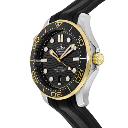 Omega Seamaster Diver 300 M Yellow Gold & Steel Rubber Strap Men‘s Watch Model 210.22.42.20.01.001. Stainless Steel and Yellow Gold case with Black Rubber strap. Tang clasp. Uni-Directional Rotating bezel. Dial description: Yellow Gold tone skeleton hands and Circle/Index hour markers with minute markers around the outer rim on a Black Laser-Engraved Wave dial. Automatic -Chronometer movement. Powered by Omega Caliber 8800 engine with 55 hours power reserve. Watch functions: Date, Power Reserve, Hour, Minute, Second. Scratch Resistant Sapphire crystal. Round case shape. Case size: 42mm. Transparent case back. . Also known as model: 210-22-42-20-01-001, 21022422001001.