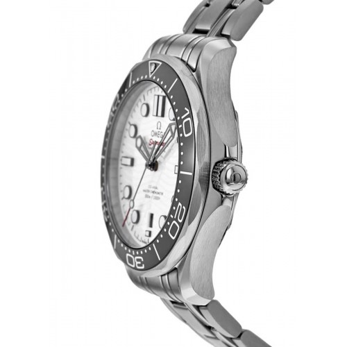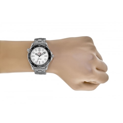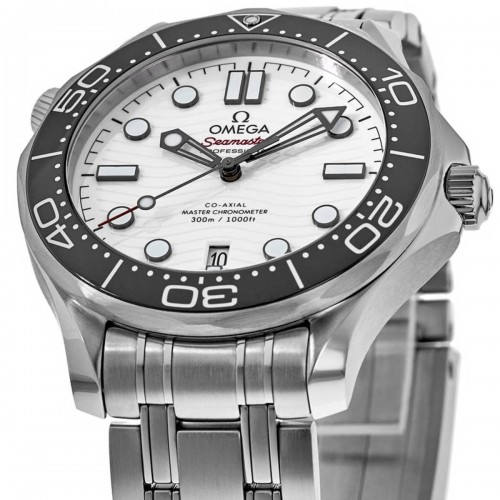Omega Seamaster Diver 300 M White Dial Steel Bracelet Men‘s Watch Model 210.30.42.20.04.001. Stainless Steel case with Brushed and Polished Stainless Steel watch band. Brushed and Polished Stainless Steel Deployment with Push Button clasp. Uni-Directional Rotating with Ceramic Insert bezel. Dial description: Laser-Engraved Waves, Silver tone skeleton hands and Circle/Index hour markers with minute markers around the outer rim on a White dial. Automatic -Chronometer movement. Powered by Omega Caliber 8800 engine with 48 hours power reserve. Watch functions: Date, Power Reserve, Hour, Minute, Second. Scratch Resistant Sapphire crystal. Round case shape. Case size: 42mm. Case thickness: 13mm. Transparent case back. .