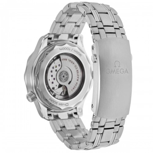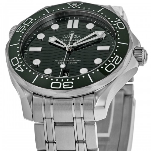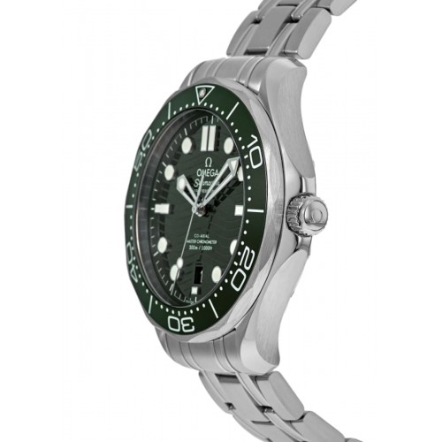 Omega Seamaster Diver 300 M Green Dial Steel Bracelet Men‘s Watch Model 210.30.42.20.10.001. Stainless Steel case with Silver Stainless Steel watch band. Uni-Directional Rotating bezel. Dial description: Silver tone hands and Index/Dot hour markers with minute markers around the outer rim on a Green dial. Automatic Chronometer movement. Powered by Omega Calibre 8800 engine with 55 hours power reserve. Watch functions: Date, Power Reserve, Hour, Minute, Second. Screw In crown. Scratch Resistant Sapphire crystal. Round case shape. Case size: 42mm. Transparent case back. . Also known as model: 21030422010001.