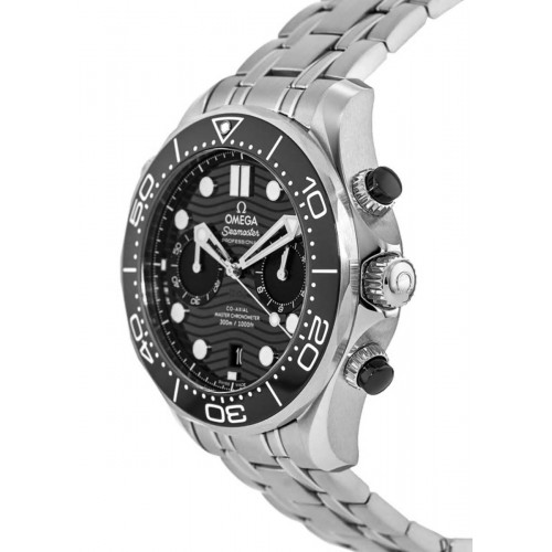 Omega Seamaster Diver 300 M 44mm Chronograph Black Dial Steel Men‘s Watch Model 210.30.44.51.01.001. Stainless Steel case with Brushed and Polished Stainless Steel watch band. Brushed and Polished Stainless Steel Deployment with Push Button clasp. Uni-Directional Rotating bezel. Dial description: Laser-Engraved Waves, Silver tone skeleton hands and Circle/Index hour markers with minute markers around the outer rim and 2 sub-dials on a Black dial. Automatic Chronometer Chronograph movement. Calendar: Date at 6 o‘clock. Chronograph sub-dials display: 60 Minute, 12 Hours. Powered by Omega Caliber 9900 engine with 60 hours power reserve. Watch functions: Date, Power Reserve, Hour, Minute, Second. Scratch Resistant Sapphire crystal. Round case shape. Case size: 44mm. Transparent case back. . Also known as model: 21030445101001, 210-30-44-51-01-001.