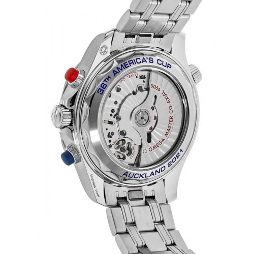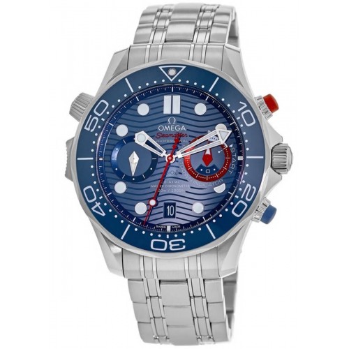 Omega Seamaster Diver 300 M Chronograph America‘s Cup Edition Men‘s Watch Model 210.30.44.51.03.002. Stainless Steel case with Stainless Steel watch band. Deployment clasp. Uni-Directional Rotating bezel. Dial description: Silver tone hands and Dot hour markers with minute markers around the outer rim and 2 sub-dials on a Blue dial. Automatic movement. Calendar: Date at 6 o‘clock. Chronograph sub-dials display: 60 Second, 12 Hours. Powered by Omega Calibre 9900 engine with 60 hours power reserve. Watch functions: Date, Power Reserve, Hour, Minute, Second, Chronograph. Screw Down crown. Scratch Resistant Sapphire crystal. Round case shape. Case size: 44mm. Transparent case back. . Also known as model: 21030445103002.