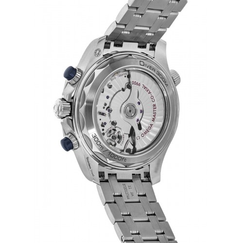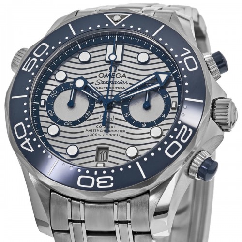 Omega Seamaster Diver 300 M 44mm Chronograph Grey Dial Steel Men‘s Watch Model 210.30.44.51.06.001. Stainless Steel case with Brushed and Polished Stainless Steel watch band. Brushed and Polished Stainless Steel Deployment with Push Button clasp. Uni-Directional Rotating bezel. Dial description: Laser-Engraved Waves, Blue tone skeleton hands and Circle/Index hour markers with minute markers around the outer rim and 2 sub-dials on a Grey dial. Automatic Chronometer Chronograph movement. Calendar: Date at 6 o‘clock. Chronograph sub-dials display: 60 Minute, 12 Hours. Powered by Omega Caliber 9900 engine with 60 hours power reserve. Watch functions: Date, Power Reserve, Hour, Minute, Second. Scratch Resistant Sapphire crystal. Round case shape. Case size: 44mm. Transparent case back. . Also known as model: 21030445106001, 210-30-44-51-06-001.