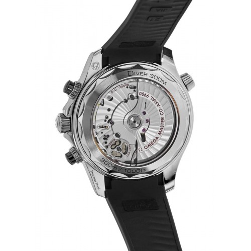 Omega Seamaster Diver 300 M Black Chronograph Rubber Strap Men‘s Watch Model 210.32.44.51.01.001. Stainless Steel case with Black Rubber strap. Tang clasp. Uni-Directional Rotating bezel. Dial description: Laser-Engraved Waves, Silver tone skeleton hands and Circle/Index hour markers with minute markers around the outer rim and 2 sub-dials on a Black dial. Automatic Chronometer Chronograph movement. Calendar: Date at 6 o‘clock. Chronograph sub-dials display: 60 Minute, 12 Hours. Powered by Omega Caliber 9900 engine with 60 hours power reserve. Watch functions: Date, Power Reserve, Hour, Minute, Second. Scratch Resistant Sapphire crystal. Round case shape. Case size: 44mm. Transparent case back. . Also known as model: 21032445101001, 210-32-44-51-01-001.