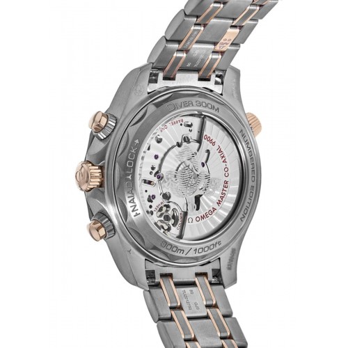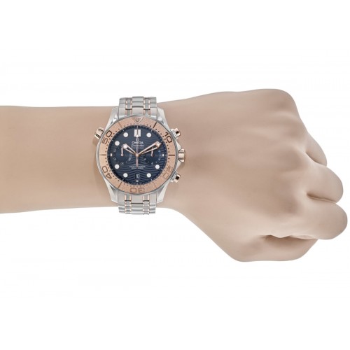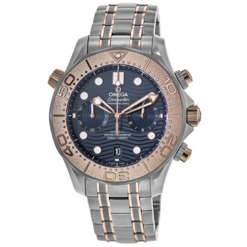 Omega Seamaster Diver 300 M Co-Axial Chronograph Blue Dial Titanium & Gold Men‘s Watch Model 210.60.44.51.03.001. Grey Titanium case with Titanium with Rose Gold Links watch band. Deployment with Push Button and Foldover clasp. Uni-Directional Rotating bezel. Dial description: Rose Gold tone hands and Dot hour markers with minute markers around the outer rim and 2 sub-dials on a Blue dial. Automatic- Chronometer Chronograph movement. Calendar: Date at 6 o‘clock. Chronograph sub-dials display: 60 Second, 12 Hours. Powered by Omega Calibre 9900 engine with 60 hours power reserve. Watch functions: Date, Power Reserve, Hour, Minute, Second, Chronograph. Screw Down crown. Scratch Resistant Sapphire crystal. Round case shape. Case size: 44mm. Transparent case back. . Also known as model: 21060445103001.