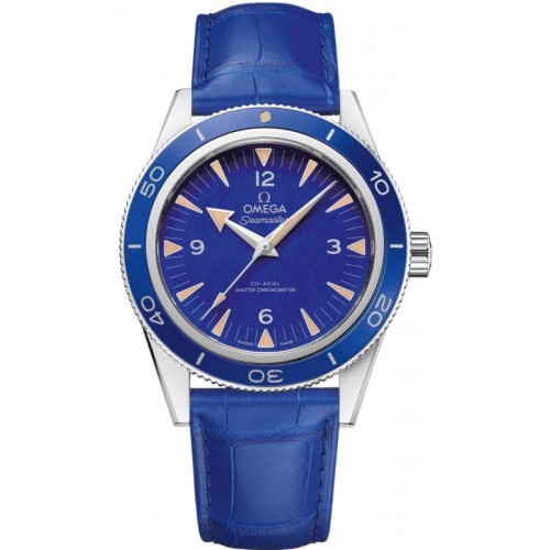 Omega Seamaster 300 Master Co-Axial Chronometer 41mm Blue Dial Leather Strap Men‘s Watch Model 234.93.41.21.99.002. Platinum case with Blue Leather Alligator strap. Deployment with Foldover clasp. Uni-Directional Rotating bezel. Dial description: 18K White Gold hands and Index/Arabic Numeral hour markers with minute markers around the outer rim on a Blue dial. Automatic movement. Powered by Omega Calibre 8913 engine with 60 hours power reserve. Watch functions: Power Reserve, Hour, Minute, Second. Screw In crown. Scratch Resistant Sapphire crystal. Round case shape. Case size: 41mm. Transparent case back. . Also known as model: 23493412199002.