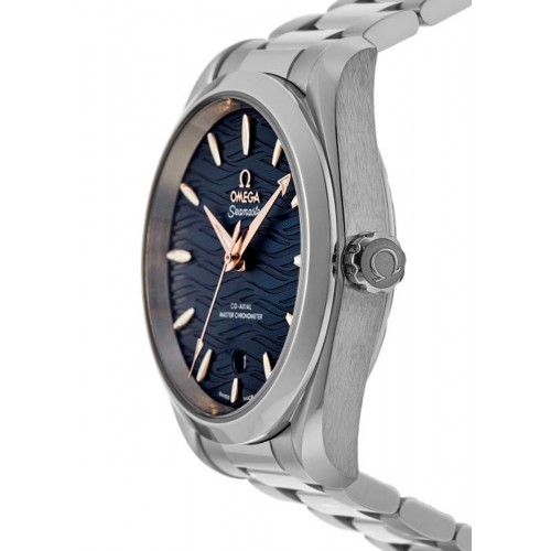 Omega Seamaster Aqua Terra 150m Master Co-Axial Blue Dial Stainless Steel Men‘s Watch Model 220.10.38.20.03.002. Stainless Steel case with Silver Stainless Steel watch band. Fixed bezel. Dial description: Rose Gold tone hands and Index hour markers on a waved Blue dial. Automatic - Chronometer movement. Powered by Omega Caliber 8800 engine with 55 hours power reserve. Watch functions: Date, Power Reserve, Hour, Minute, Second. Scratch Resistant Sapphire crystal. Round case shape. Case size: 38mm. Case thickness: 13.2mm. Transparent case back. . Also known as model: 22010382003002.