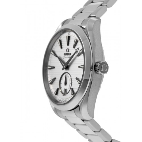 Omega Seamaster Aqua Terra Small Seconds 41mm Silver Dial Steel Men‘s Watch Model 220.10.41.21.02.002. Stainless Steel Brushed and Polished case with Silver Stainless Steel Brushed and Polished watch band. Deployment with Push Button clasp. Fixed bezel. Dial description: Grey Luminous filled hands and Index hour markers with minute markers around the outer rim on a Silver dial. Automatic - Chronometer movement. Calendar: Date at 6 o‘clock. Chronograph sub-dials display: 60 Second. Powered by Omega Caliber 8916 engine with 60 hours power reserve. Watch functions: Date, Power Reserve, Hour, Minute, Second. Screw in crown. Scratch Resistant Sapphire crystal. Case size: 41mm. Case thickness: 13.2mm. Transparent case back. . Also known as model: 22010412102002.