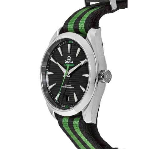 Omega Seamaster Aqua Terra 150m Master Co-Axial Golf Edition Men‘s Watch Model 220.12.41.21.01.002. Stainless Steel case with Two-Tone Fabric strap. Tang clasp. Fixed bezel. Dial description: Silver-tone hands with LumiNova fill and index hour markers with minute markers around the outer rim and a green seconds hand on a Black with horizontal dial. Automatic - Chronometer movement. Powered by Omega Calibre 8900 engine with 60 hours power reserve. Watch functions: Date, Hour, Minute, Second. Screw in crown. Scratch Resistant Sapphire crystal. Case size: 41mm. Transparent case back. . Also known as model: 7612586272202.