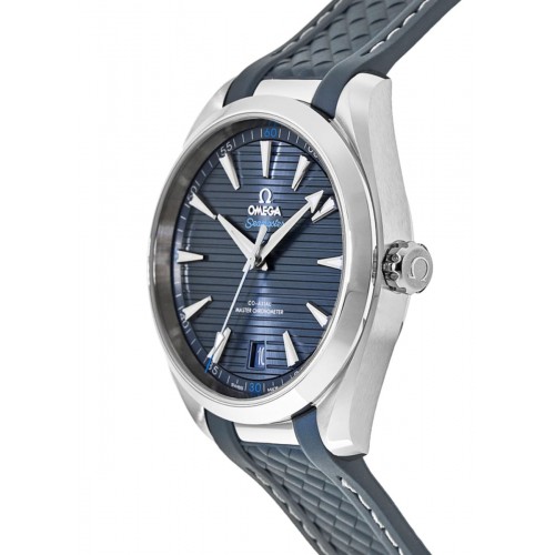 Omega Seamaster Aqua Terra 150m Master Co-Axial Blue Dial Rubber Strap Men‘s Watch Model 220.12.41.21.03.001. Stainless Steel case with Blue Rubber strap. Deployment with Push Button and Foldover clasp. Fixed Stainless Steel bezel. Dial description: Silver tone luminous hands and Index hour markers with minute markers around the outer rim on a Horizontal Teak Design Blue dial. Automatic - Chronometer movement. Powered by Omega Caliber 8900 engine with 60 hours power reserve. Watch functions: Date, Power Reserve, Hour, Minute, Second. Screw in crown. Scratch Resistant Sapphire crystal. Case size: 41mm. Case thickness: 13.2mm. Transparent case back. . Also known as model: 22012412103001.