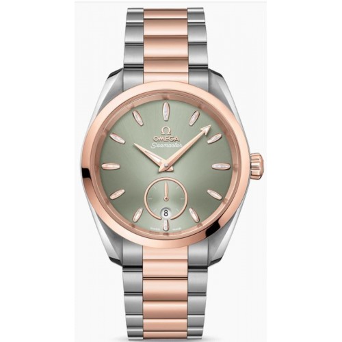 Omega Seamaster Aqua Terra 150m Master Co-Axial Light Green Dial Steel Women‘s Watch Model 220.20.38.20.10.001. 18K Sedna Gold and Stainless Steel case with 18K Sedna Gold and Stainless Steel watch band. Fixed bezel. Dial description: 18K Sedna Gold Luminous filled Hands and Index Hour Markers with a Mother of Pearl inlay and the Date and Small Seconds displayed at the 6 o‘clock position on a Sun brushed Light Green dial. Automatic - Chronometer movement. Calendar: Date at 6 o‘clock. Chronograph sub-dials display: Small Seconds. Powered by Omega Caliber 8802 engine with 55 hours power reserve. Watch functions: Date, Power Reserve, Hour, Minute, Second. Scratch Resistant Sapphire crystal. Case size: 38mm. Transparent case back. . Also known as model: 22020382010001.